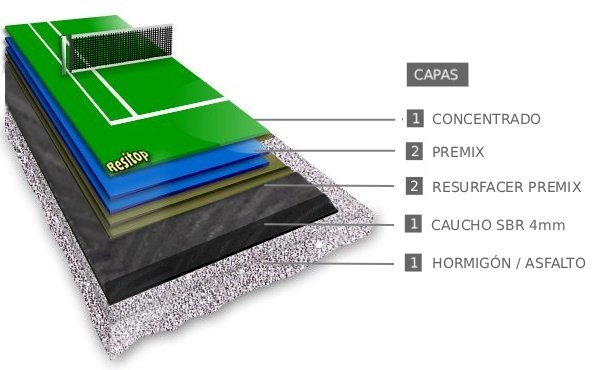 Multilayer pavement on prefabricated elastic base, placed on asphalt agglomerate or concrete. For high competition tennis courts and multipurpose sports surfaces in elementary facilities of schools, town halls and sports clubs for the practice of basic sports such as basketball, handball, indoor soccer… both indoors and outdoors.