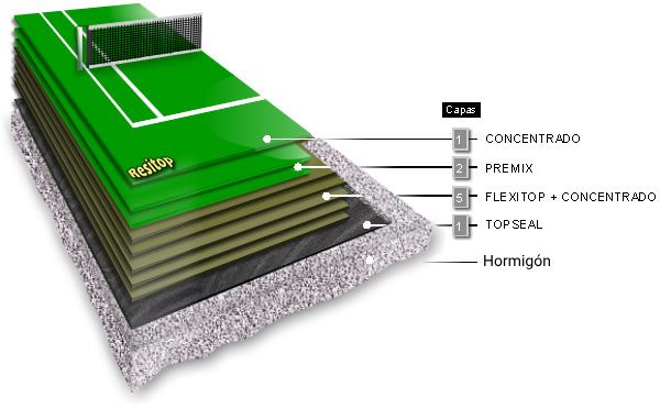 Revestimento multicamada sobre base de betão para campos de ténis de alta competição e superfícies desportivas polivalentes em instalações de escolas primárias, câmaras municipais e clubes desportivos para a prática de desportos de base como basquetebol, andebol, futebol de salão, ténis… tanto no interior como no exterior.