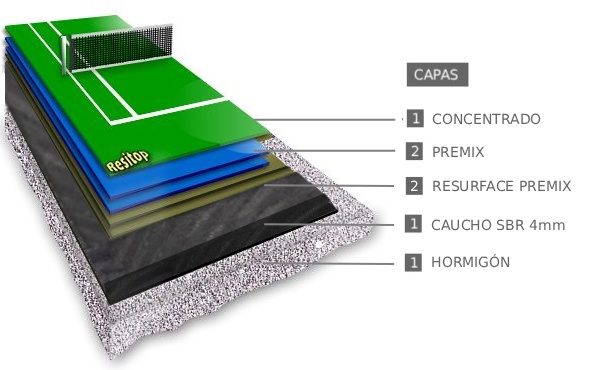 Pavimento multicapa sobre base elástica prefabricada, colocada sobre aglomerado asfáltico u hormigón. Para pistas de tenis de alta competición y superficies deportivas multiuso en instalaciones elementales de colegios, ayuntamientos y clubs deportivos para la práctica de los deportes base como el baloncesto, balón mano, fútbol sala… tanto en interiores como al aire libre.