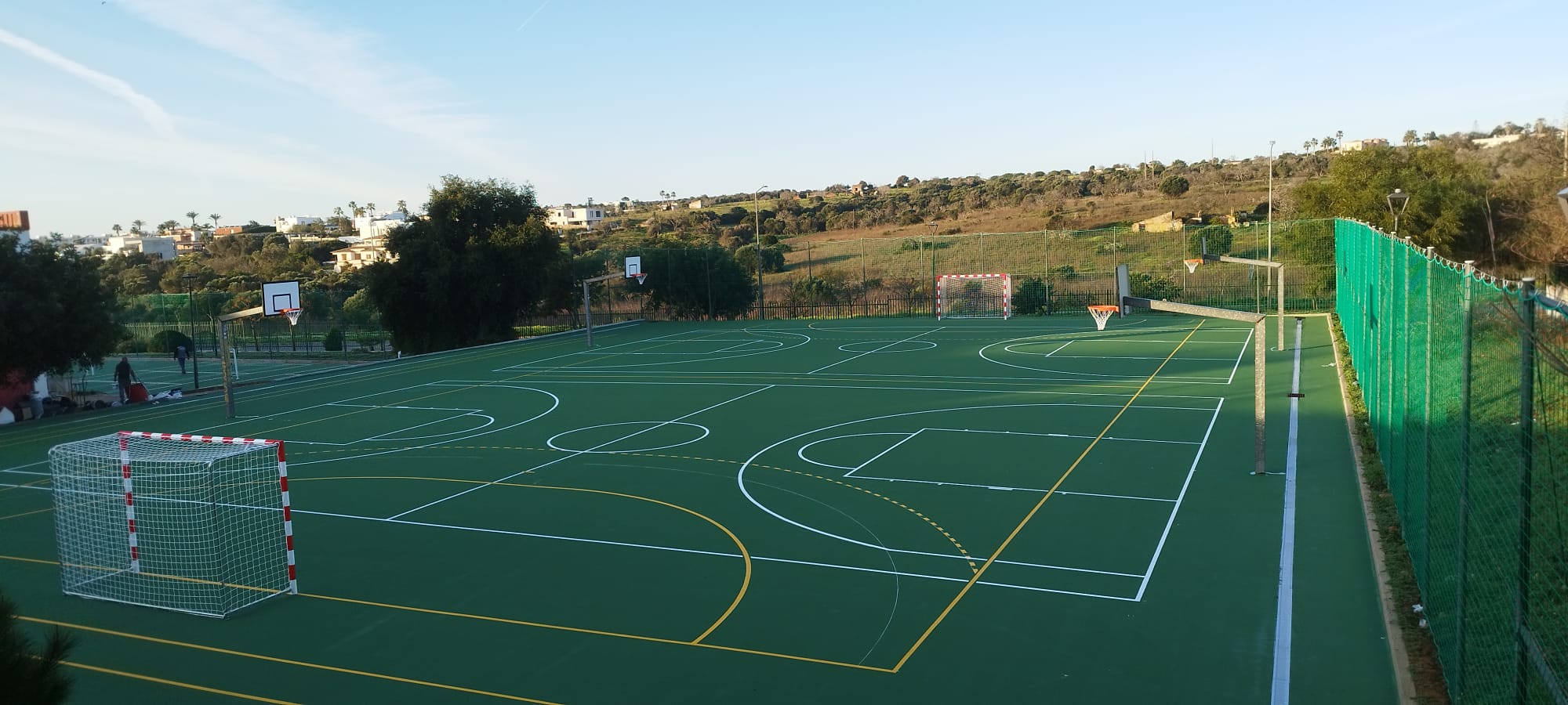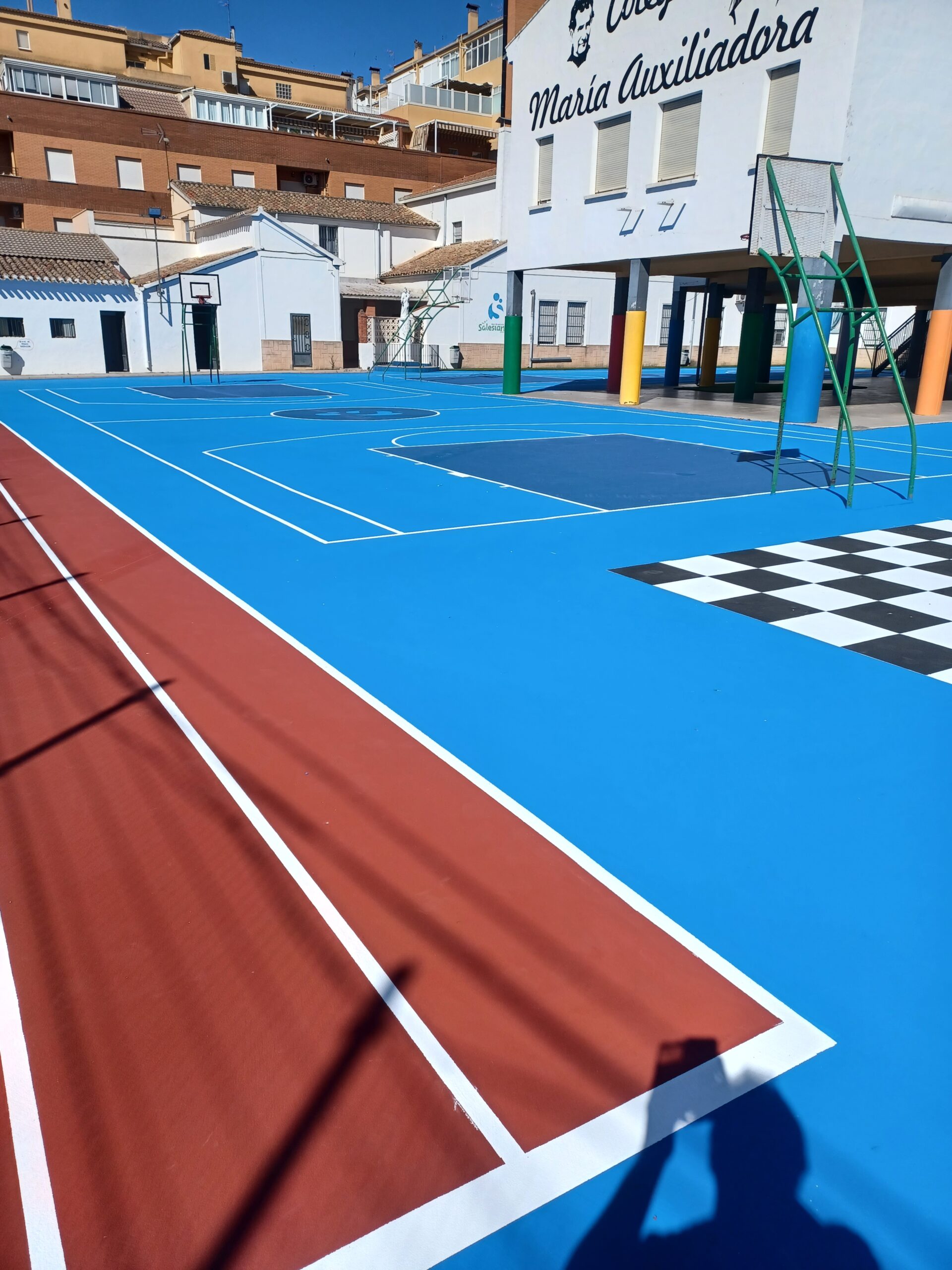 Revestimiento multicapa sobre base asfáltica para superficies deportivas multiuso en instalaciones elementales de colegios, ayuntamientos y clubs deportivos para la práctica de los deportes base como el tenis, baloncesto, balón mano, fútbol sala… tanto en interiores como al aire libre.