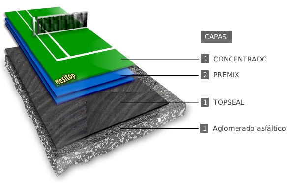 Revestimiento de 1 a 3 mm de espesor, continuo, en colores, impermeable, altamente resistente al desgaste y a la acción de los agentes atmosféricos en los climas más extremos, su micro rugosidad lo hace idóneo para una práctica deportiva segura tanto al aire libre como en interiores.