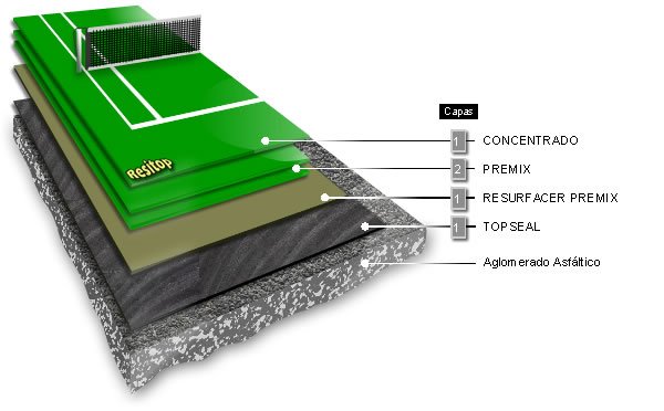 Revestimiento de 2 a 3 mm de espesor, continuo, en colores, impermeable, altamente resistente al desgaste y a la acción de los agentes atmosféricos en los climas más extremos, su micro rugosidad lo hace idóneo para una práctica deportiva segura tanto al aire libre como en interiores.