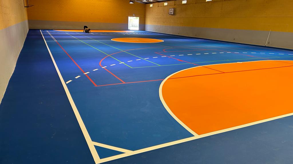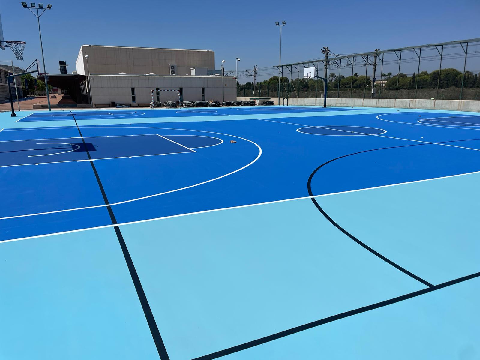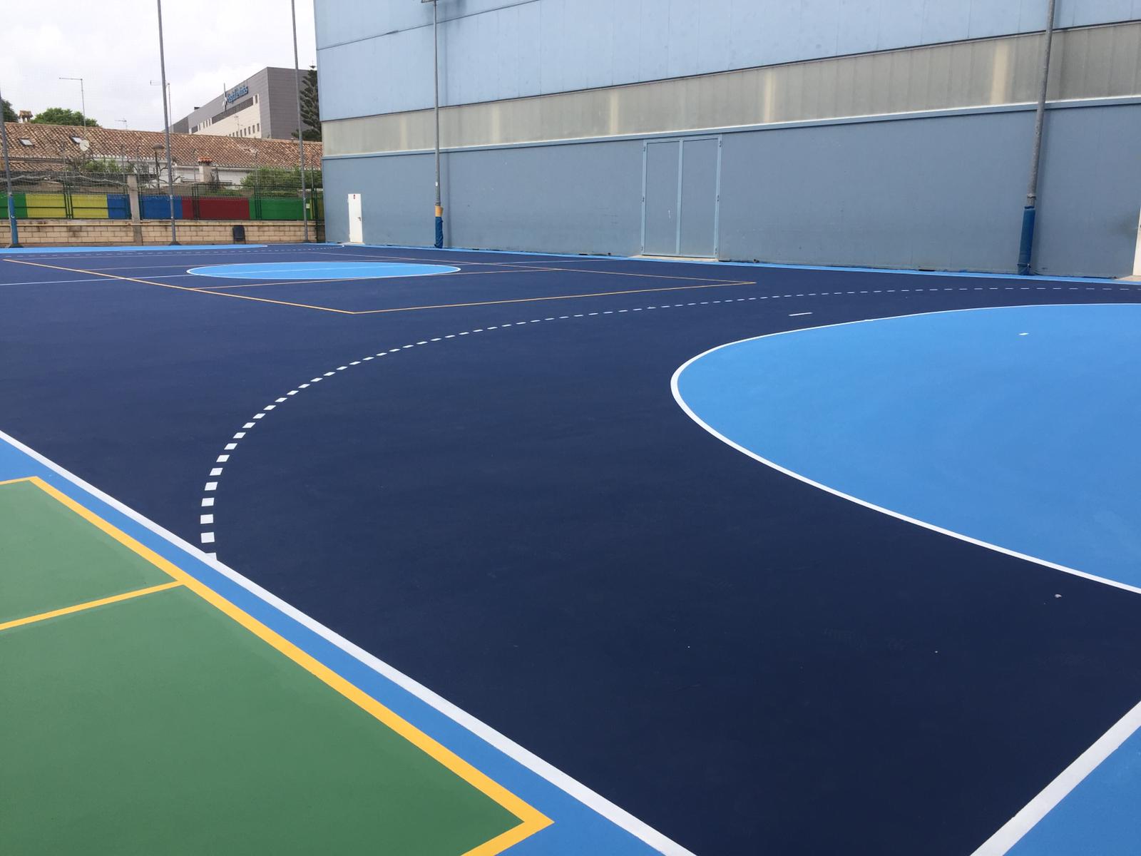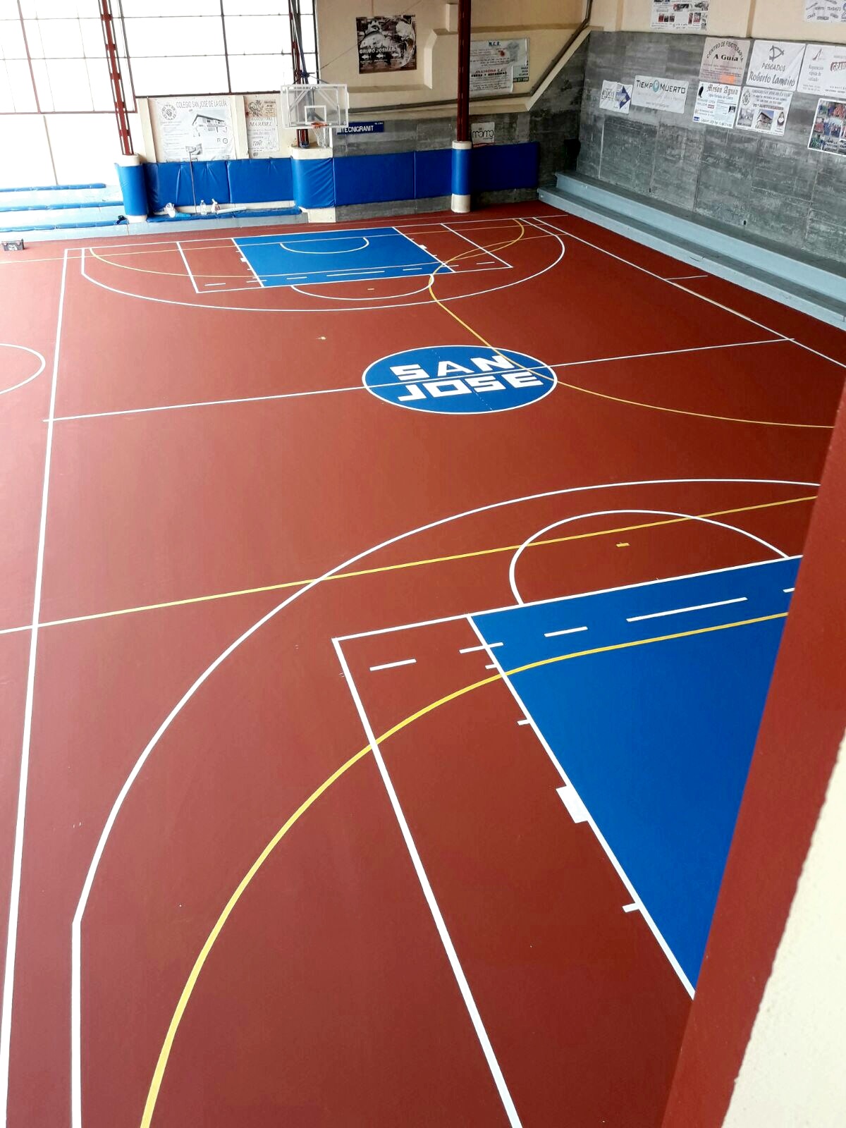 Revestimiento multicapa sobre hormigón para superficies deportivas multiuso en instalaciones elementales de colegios, ayuntamientos y clubs deportivos para la práctica de los deportes base como el tenis, baloncesto, balón mano, fútbol sala… tanto en interiores como al aire libre.